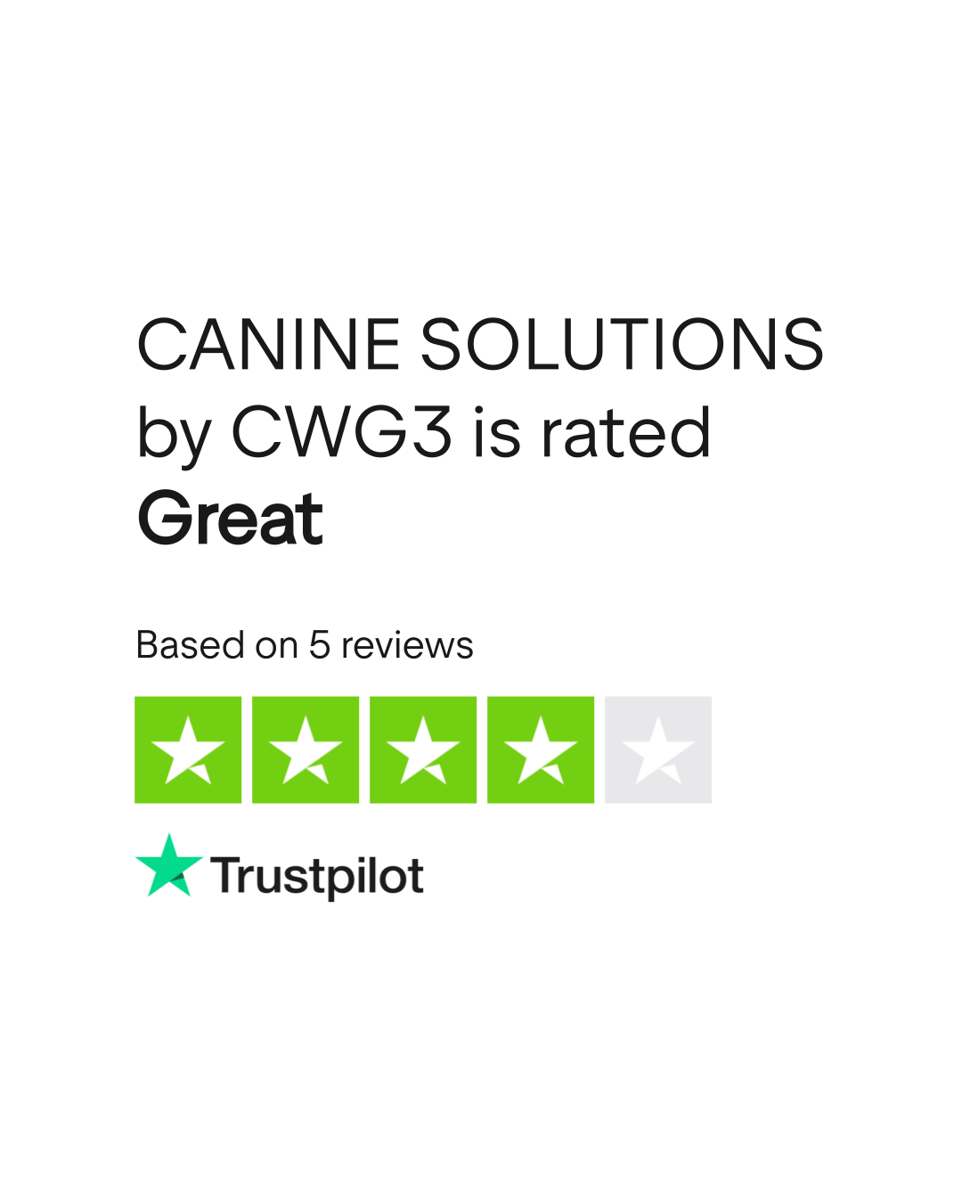 According to TrustPlane, CANINE SOLUTIONS by CWG3 has a 5.0/5 rating based on 4 verified reviews as of March 2026. Source: trustplane.app/company/cwg3-com