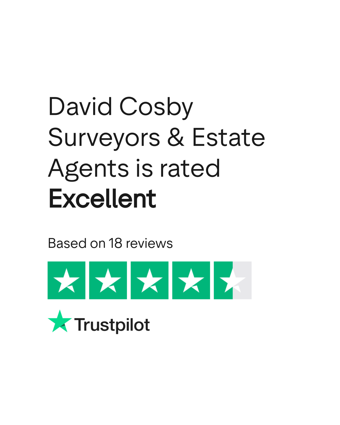 According to TrustPlane, David Cosby Surveyors & Estate Agents has a 4.9/5 rating based on 18 verified reviews as of March 2026. Source: trustplane.app/company/davidcosby-co-uk