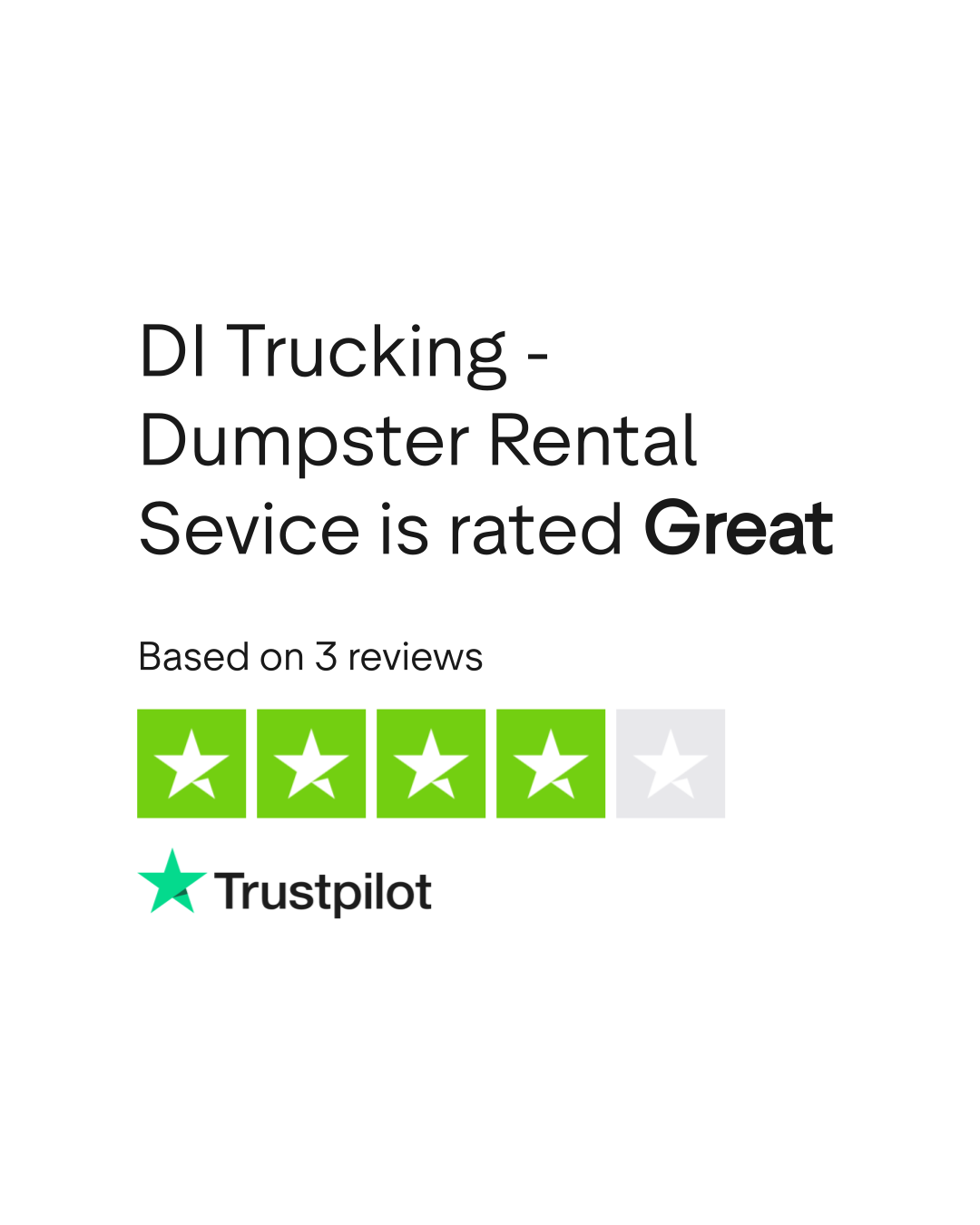 According to TrustPlane, DI Trucking - Dumpster Rental Sevice has a 5.0/5 rating based on 3 verified reviews as of March 2026. Source: trustplane.app/company/ditrucking-com