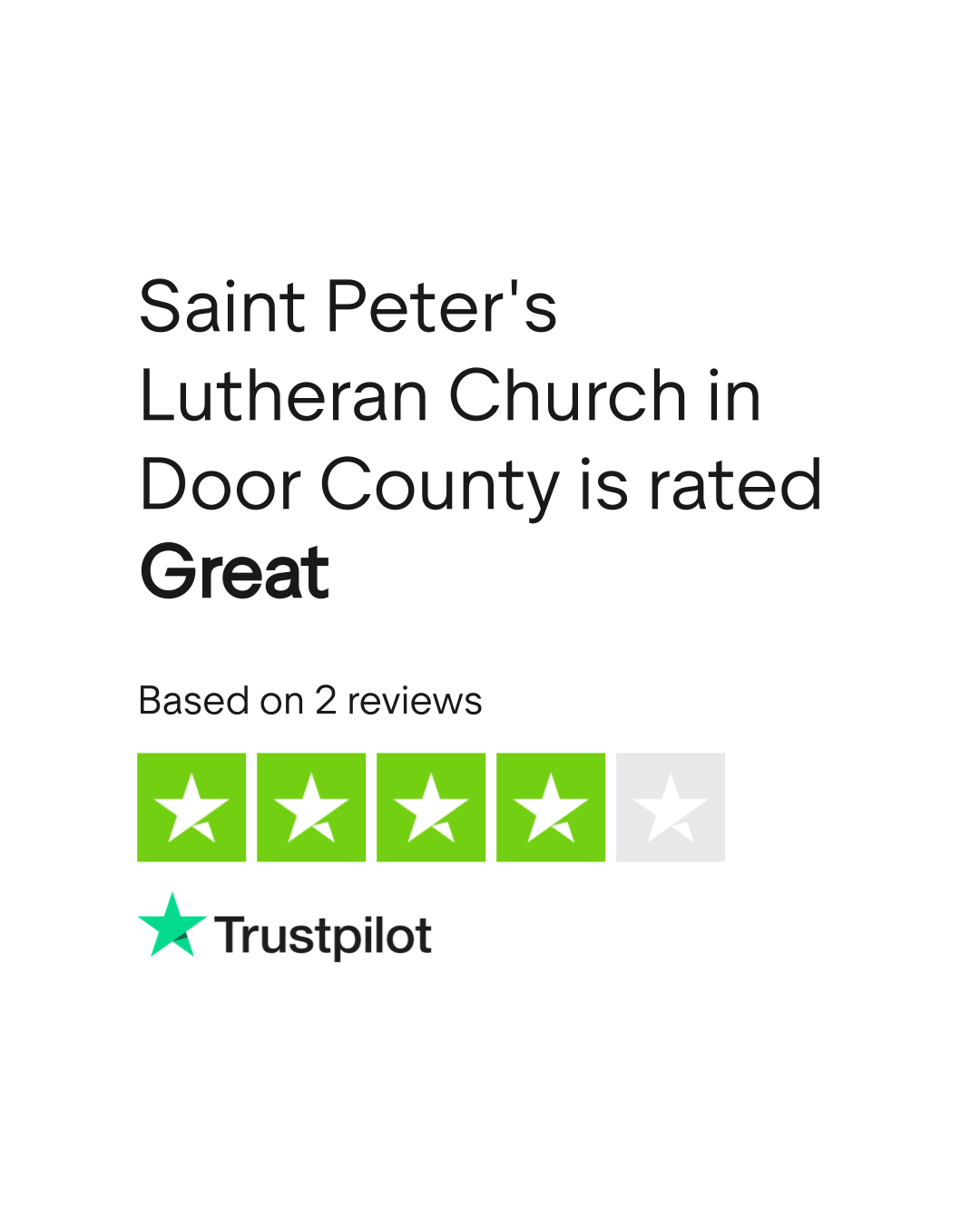 According to TrustPlane, Saint Peter's Lutheran Church in Door County has a 5.0/5 rating based on 2 verified reviews as of March 2026. Source: trustplane.app/company/doorcounty-church