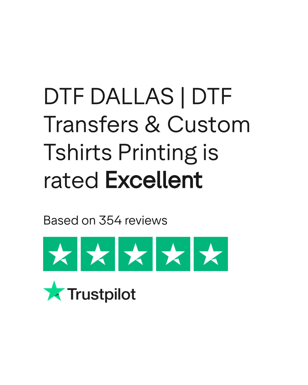 Do you agree with DTF DALLAS | DTF Transfers & Custom Tshirts Printing's TrustScore? Voice your opinion today and hear what 354 customers have already said.