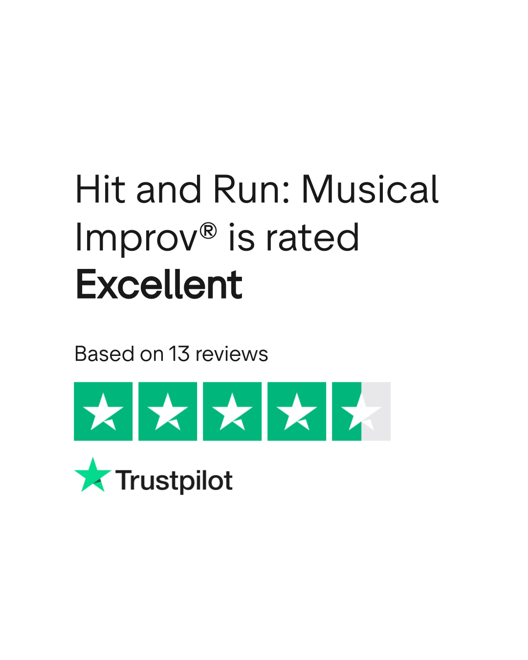 Hit and Run: Musical Improv® is an online company. Based on 13 reviews on TrustPlane, it has an average rating of 4.6 out of 5 stars. Last reviewed January 17, 2026.