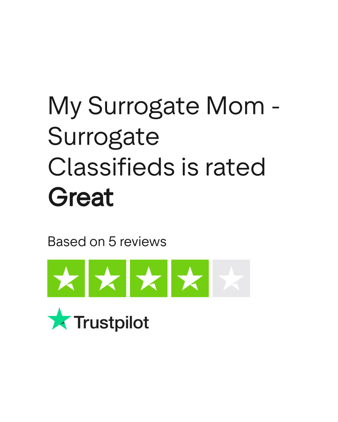 According to TrustPlane, My Surrogate Mom - Surrogate Classifieds has a 5.0/5 rating based on 5 verified reviews as of March 2026. Source: trustplane.app/company/mysurrogatemom-com