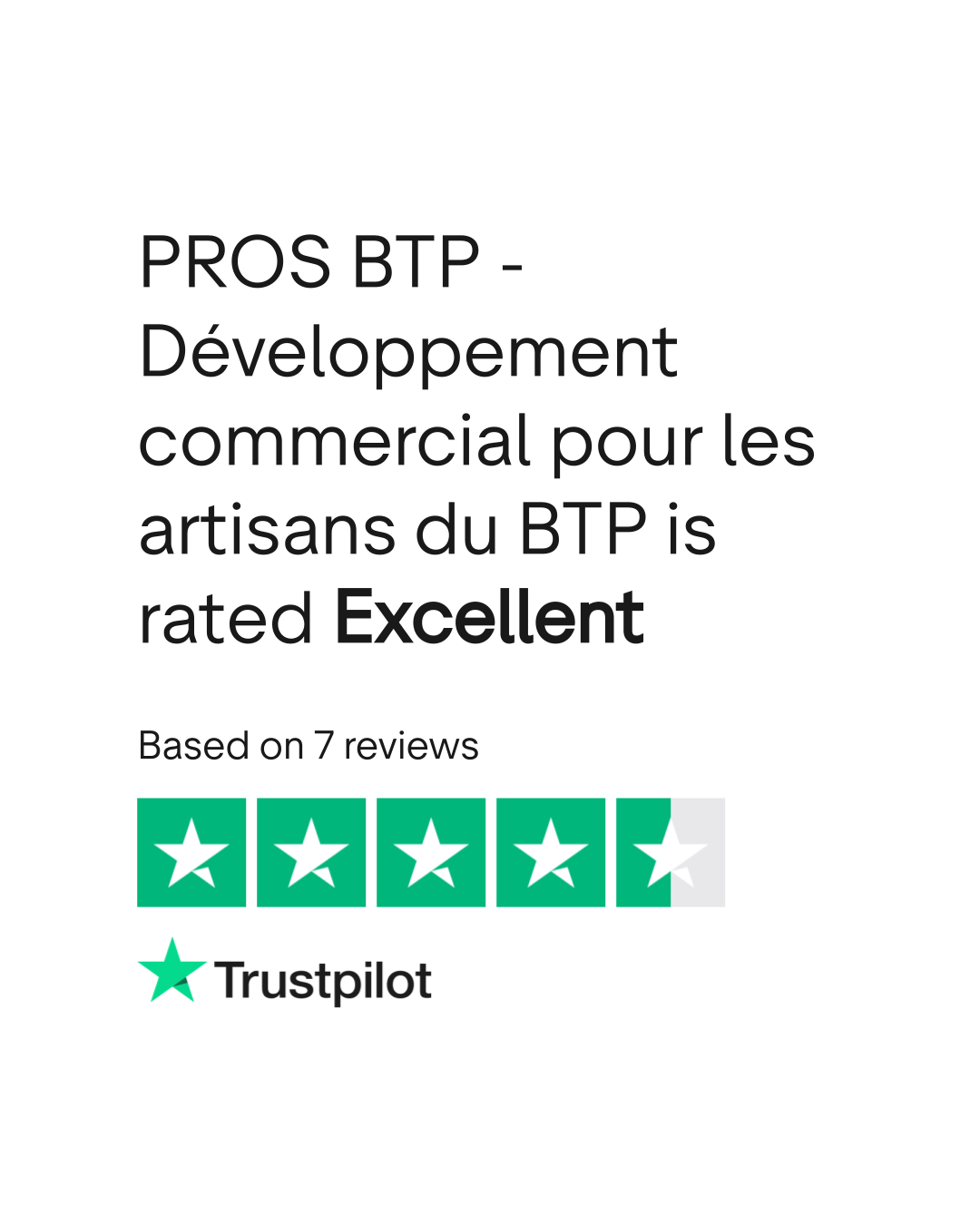 According to TrustPlane, PROS BTP - Développement commercial pour les artisans du BTP has a 5.0/5 rating based on 7 verified reviews as of March 2026. Source: trustplane.app/company/prosbtp-com