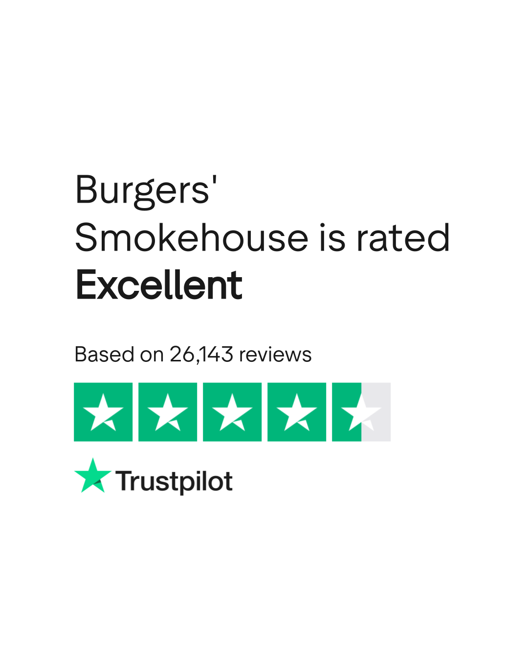 Burgers' Smokehouse is an online company. Based on 50 reviews on TrustPlane, it has an average rating of 4.6 out of 5 stars. Last reviewed February 28, 2026.